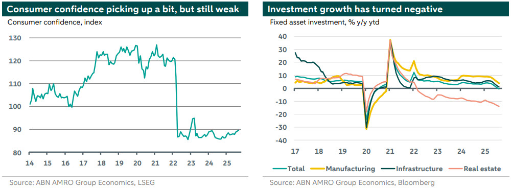 All told, macro imbalances remain elevated, with the supply side still stronger than the demand side, while deflationary pressures remain (core inflation is picking up, but remains quite low). These imbalances reflect the growth model of recent years. This model prioritises the support of high-tech manufacturing and tech self-reliance – partly in response to more hawkish US trade/tech policies – over raising consumption. This has freed up capacity for exports, while inflation and currency developments help external competitiveness. The campaign against excessive competition is not really moving the needle in this respect. With global pushback against China’s imbalances rising, the question is how sustainable this externally-led growth model still is. October exports provided a warning signal, while the IMF recently repeated its call on Beijing to reduce imbalances. Given ongoing tensions with the US/West, we assume Beijing will not abandon its focus on tech development next year. Still, taking into account what has been stated about the 15th Five-Year Plan (2026-2030) so far, we sense the government feels somewhat more urgency to fix the deficiencies of China’s model, and will step up efforts to support household income, consumption, and broader domestic demand.