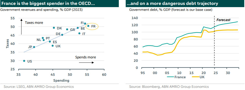 Actually, France is in a much worse shape – and not simply because of its merry-go-round governments over the past year (four and counting, lasting 3 months on average). France has struggled much more than the UK to get a grip on its deficit, while debt dynamics are made worse by its very low inflation rate (c1%) and interest rates that are clearly too high for France’s economic circumstances. Given the political paralysis that has made relatively modest reforms next to impossible – such as raising the pension age to international standards – we have little confidence that France will be able to implement the necessary fiscal adjustment to return debt to a sustainable trajectory in the near future. Elections, whether of the snap variety or as scheduled in 2027, bring as much risk as they do promise: if the far right or the far left come to power, France may end up with a Liz Truss-like government that cares little for bond markets, unless a crisis erupts. This could well end up bringing things to a head. A more benign scenario would see the return of a centrist majority that seeks to more aggressively rein in France’s high deficits. The middle ground would be a continuation of what we see now: a slow-burning muddling through, with France’s debt ratio on a gently rising trajectory, but not alarming enough that it causes a crisis.