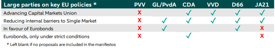 On the policymaking front, the Dutch elections do send an important message to Europe. The incoming Dutch government is expected to adopt a significantly more constructive approach towards European integration than its predecessor. While D66 has consistently been pro-European, there now appears to be a majority among the six largest parties in favour of advancing integration on key EU policy issues. The table below summarises the manifesto positions of these parties on key EU policy areas. There is broad consensus on enhancing the Single Market and advancing the Capital Markets Union. However, there is less agreement on common financing, such as Eurobonds.