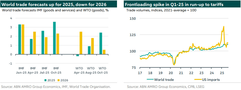 Trade frontloading by US importers and foreign exporters in the run-up to anticipated higher US tariffs. This put the base for global trade higher in early 2025. Imports into tariff ‘epicentre’ the US surged in Q1, driving a spike of three full points in CPB’s world trade volume index in March (see chart). This index fell back somewhat in April-June as the effects of trade frontloading unwound, but nowhere near as much as we had expected, and imports even began to rise again in July. The global CPB index shows an average of 4.9% y/y growth in world (goods) trade volumes in January-August 2025 (2024: 2.2%). Due to these shifts, the forecasts for 2025 have been revised up, but the forecasts for 2026 have been generally revised down, meaning that the tariff impact is more spread out than previously expected (albeit also generally lower on aggregate).