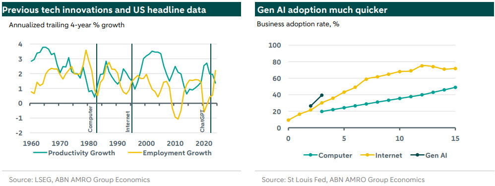 Since ChatGPT’s launch in November 2022, the US has seen a decline in four-year average productivity but rising employment growth. While some employment measures have stalled this year, much of this is due to supply factors. Meanwhile, as the right-hand chart below shows, adoption of AI is much faster than for other technologies, which could accelerate job displacement and test the economy’s ability to create new complementary roles.