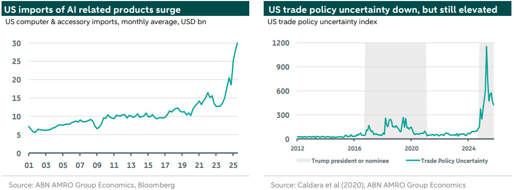 Limited pass-through in the US: The pass-through of higher tariffs into US consumer prices appears to be taking longer than earlier anticipated, which has softened the drag from tariffs on US consumption and imports so far.