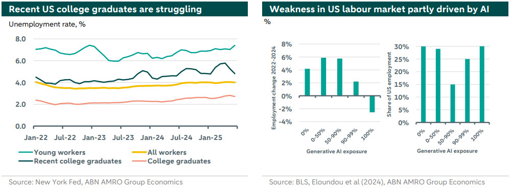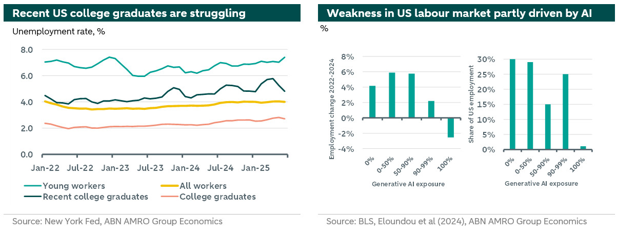 The fact that the impact of AI on labour markets is broader has some silver linings. Previous technological shifts often hit local labour markets hard, wiping out most jobs in specific towns, amplifying local downturns. With AI, job losses are likely to be more dispersed, making them easier to absorb. Recent developments in the US labour market suggest that job losses are indeed not concentrated geographically, but rather demographically. Young graduates are struggling to find work, with highly educated but inexperienced workers most affected. This is not just an AI story. College educated workers have been losing their relative advantage, also before ChatGPT, and the downturn can also partially be attributed to an unwind of the post-pandemic labour hoarding. Still, sectoral data using AI exposure measures (Eloundou et al., 2024) does show slower job growth, or even losses, in sectors most exposed to generative AI. Overall employment is still growing, but this is just the start of adoption. AI developments put jobs in the 90–99% and 50–90% exposure buckets at particularly high risk.