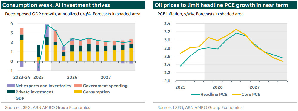 The economy is running at two speeds. AI and related sectors are thriving, whereas most other areas are stagnant or contracting. This creates a challenging environment for policy-making and economic forecasting. The Trump administration is fully committed to AI, implementing an Action Plan that reduces regulatory oversight and encourages investment across the supply chain. Meanwhile, the Federal Reserve has resumed easing its policy rate to support a weakening labour market. However, it remains unclear how this shift in monetary policy will affect a bifurcated economy, where supply-side factors are significant. The outlook is further muddied by uncertainty over the timing and magnitude of trade and immigration policy impacts; both are expected to increase prices and suppress growth, but have yet to fully be reflected in headline data. We expect 2026 to be characterised by a further widening of this ‘K-shaped’ economy, amplified by trade and immigration policy. Downside risk to growth is limited by fiscal and monetary easing. This keeps the economy growing at a solid pace of slightly above 2% but comes at the cost of higher inflation and larger fiscal deficits. Policy is unlikely to narrow the divide.