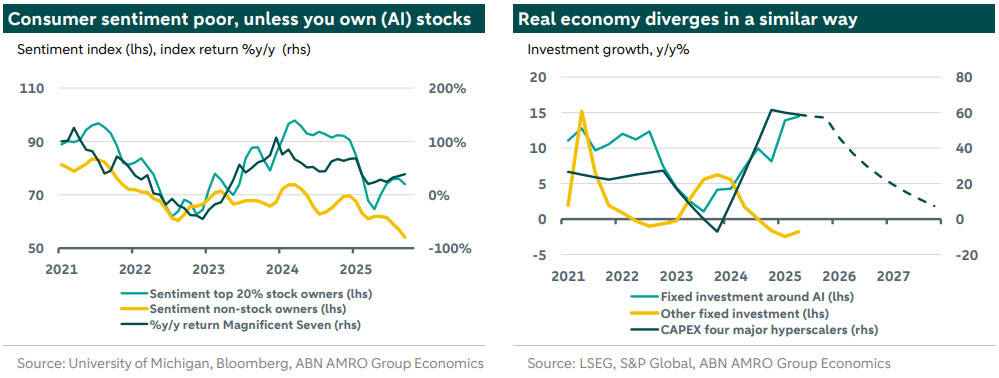 The real economy, and investment in particular, mirrors this divide. Investment in data centres has surged by over 50% per year, while other forms of fixed and residential investment are contracting. Estimates of capital expenditure by the four largest hyperscalers (builders of infrastructure) suggest their influence on headline growth figures will continue in the near term, but gradually fade. It is not clear that the expected easing by the Fed will be enough to revive the rest of the economy, especially household consumption. Fiscal policy may provide a moderate boost to investment through bonus depreciation extensions, but if anything, redistributional effects only makes things harder for most households.