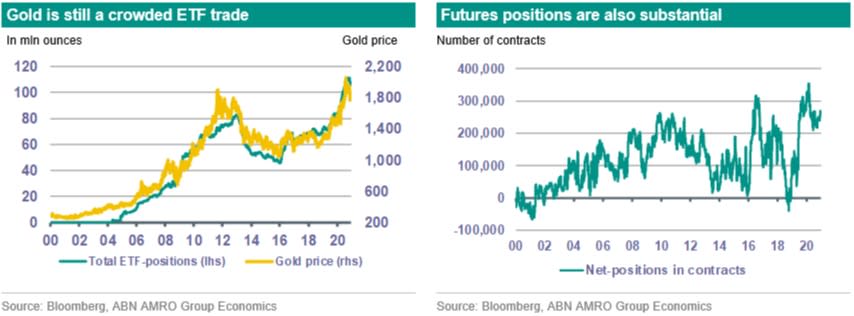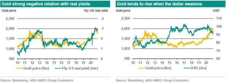 We think that the outlook for gold prices is still positive. First, we expect the Fed to keep policy rates low in the coming years. The Fed will also limit the rise in US treasury yields to support the economy. In fact we expect lower US Treasury yields for 2021. If inflation expectations stay around the current level, lower US treasury yields will result in lower US real yields. This is a clear negative for the dollar and a positive for gold prices. Second, in 2020 fiscal deficits have risen substantially. In 2021 these deficits as % of GDP will decline but they will remain substantial. It is likely that the combination of monetary stimulus and large fiscal deficit will continue to be a concern for investors. So we expect higher gold prices versus the US dollar based on these dynamics.