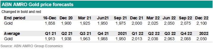 Moreover the technical picture has been deteriorating recently. Prices are holding above the 200-day moving average (USD 1,810 per ounce at the time of writing). The market has already tested this level, but prices moved above again. If there is substantial move below the 200-day moving average, the uptrend is over in our view. With substantial we mean in normal trading conditions with a weekly close below the 200-day moving average. In the coming weeks trading conditions are far from normal as the market is very thin at the end of the year and at the start of the new year. Third, with the arrival of the vaccine the economic outlook is improving. Gold prices have the tendency to weaken if an economic recovery goes hand in hand with expectations of tighter monetary policy and higher rates. But gold prices have the tendency to rise if the economy recovers but monetary stimulus remains in place and US real yields decline. This is also our base case. But we are in an exceptional environment where normal relationships are challenged. This could also be the case for this relationship.