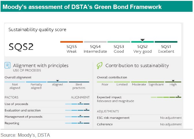 The DSTA has appointed Moody’s as a SPO for an external review of the Green Bond Framework following a tender amongst interested parties. The assessment focused in particular on whether the Framework is aligned with the ICMA Green Bond Principles (2021, with June 2022 Appendix I), adheres to the EU Taxonomy Climate Delegate Act (June 2021) and to the proposed analysis of the coherence of the framework with overall national policies and action plans (Environmental Delegated Act, June 2023)3).