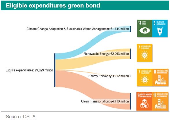 The Dutch State included four categories of eligible expenditures, which are also mapped to the Green Bond Principle categories, the relevant UN Sustainable Development Goals (SDGs) as well as Economic Activities and Environmental Objectives under the EU Taxonomy. The four categories are: