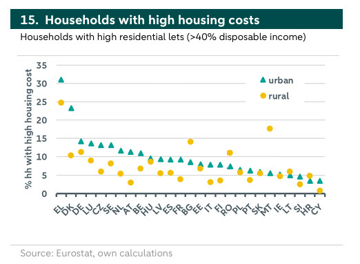 Our estimated price-to-income ratios should be taken with a grain of salt because they are based on national average prices and incomes. While some countries have equal distributions of incomes and property prices, others have a lot of variation. For example, we see that many countries suffer from local housing shortages in cities and vacancies in rural areas. Therefore, actual price-to-income ratios may be higher in cities and lower in rural areas. As an indication of the differences in housing costs, Figure 15 shows the percentage of households with high housing costs by rural and urban areas in 2023. These households (renters and owners) face housing costs of more than 40% of their disposable income. In the Netherlands, 5.4% of rural and 11.7% of urban households face high housing costs.