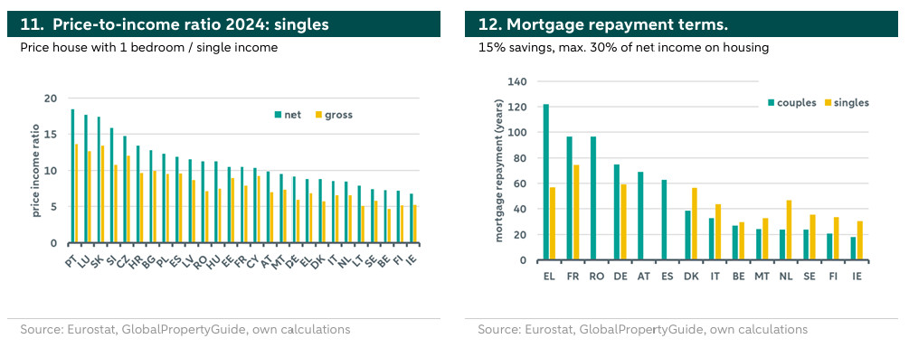 We test housing affordability in the EU under the constraint of the 30% income rule. This means we assume that an average couple's household wants to buy an average three-bedroom house and spends a maximum of 30% of net income on the mortgage. We assume an LTV ratio of 85%, meaning households contribute 15% equity (e.g., savings). We assume a mid-2024 mortgage interest rate and an annuity mortgage (stable payments). Figure 12 shows the required mortgage repayment periods, assuming that households spend at most 30% of their net income on the mortgage. A Dutch couple with two average incomes would need about 24 years to pay off the mortgage, still below the 30-year guideline*. For most EU countries, that time frame is well above 40 years. Some countries are not even shown in our chart because monthly interest payments would exceed the threshold of 30% of income, making a mortgage impossible. For single-person households, we don’t find possible repayments within 30 years in any EU country. **
