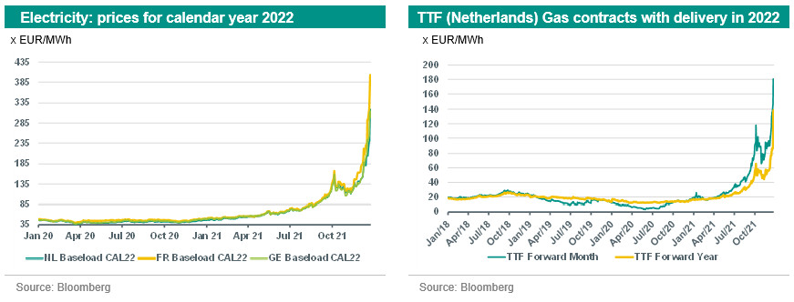 Just before Christmas, there is usually plenty of speculation as to whether it will snow or not. A white Christmas brings the ultimate Christmas feeling for many. However, today many consumers are mainly concerned about their energy bills. Dreaming of a white Christmas' is being replaced by 'hoping for a mild winter'. After all, energy prices are skyrocketing. Not only have Title Transfer Facility (TTF) gas prices reached new record heights and have risen by 800% since the start of the year before easing somewhat, while coal prices are also still relatively high. The relatively low availability of sustainable energy in recent weeks has increased the demand for energy from coal and gas-fired power stations. At the same time, this has caused the demand for CO2 rights under the European Emissions Trading System (EU ETS) to rise sharply. Here too, new record prices have been set recently. On top of that, some French nuclear power plants were shut down last week due to unexpected maintenance. All this leads to tightness in the supply of electricity and have risen with more than 550% since the start of the year to reach record highs.
