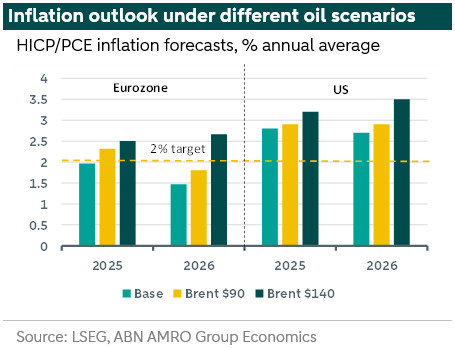 Impact on the eurozone & ECB – The two alternative oil price scenarios we sketch above would impact eurozone inflation by similar magnitudes to the US (see chart below). However, unlike the US, our eurozone base case currently sees a prolonged period of below target inflation, even factoring in the recent rebound in prices (assuming a de-escalation or at least no further escalation from here). The negative growth impact would be somewhat larger than the US, as the eurozone remains a net importer of oil and would not have the same offsetting positive impulse from higher investment in oil extraction. All told, while in the $90 scenario growth would slow to a below trend rate, in the more negative $140 scenario the economy would likely slow sharply by 2026 – close to stagnation. The final impact would also depend on whether governments do anything to offset the impact, such as tax relief. With regards LNG, while disruption to the Strait of Hormuz would likely push natural gas prices higher for a time, the rise in prices we expect to result from this would be well within the bounds of recent history, and its impact on growth and inflation therefore limited.