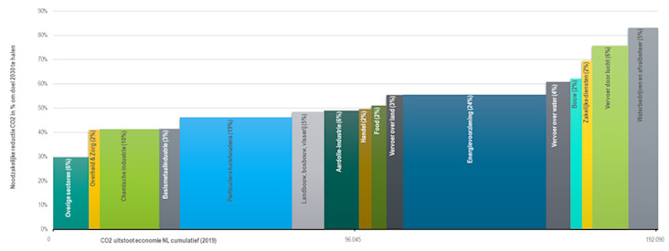 De totale Nederlandse industrie moet nog zo’n 56% aan CO2 reduceren tot aan 2030. Bijna alle sectoren moeten nog 40-50% in CO2 reduceren om het 2030 doel te bereiken.