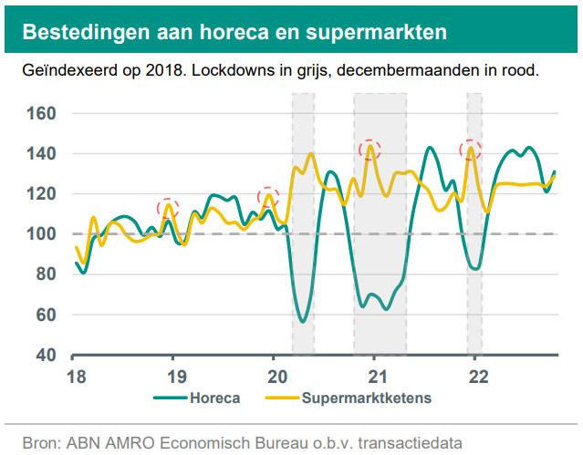 In onderstaande figuur tonen wij het verloop van consumptieve bestedingen aan Nederlandse supermarktketens en horeca van januari 2018 tot en met oktober 2022. Hiervoor gebruiken we de geaggregeerde en geanonimiseerde bestedingen van een vast panel van meer dan een miljoen rekeninghouders. Als we naar de bestedingen aan supermarkten kijken (gele lijn) dan zien we dat huishoudens in de decembermaand meer geld besteden aan boodschappen dan in de andere maanden van het jaar. Dit is niet verrassend, gezien de feestdagen in deze maand. In februari wordt er typisch minder aan supermarkten uitgegeven; deze maand telt immers minder dagen. Duidelijk te zien is de forse toename aan supermarkt uitgaven aan het begin van de eerste lockdown. Mensen aten vaker thuis en bovendien werd er ook extra ingeslagen; het zogenaamde hamsteren.