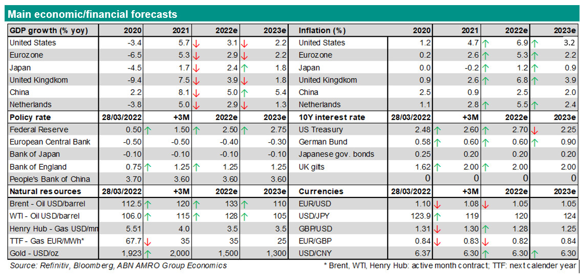 Activity data for Jan-Feb came in much stronger than expected, illustrating that piecemeal easing has started to filter through. Still, drags are intensifying: the spread of Omicron is causing a widening of lockdowns, while the Ukraine conflict will weigh on global growth and adds to inflationary pressures and capital outflows. We expect ongoing easing measures and an acceleration in credit growth, but Beijing’s growth target for 2022 of 5.5% - as announced during the NPC in early March - may prove too ambitious. All in all, we have changed our quarterly growth profile a bit and this has resulted in marginal changes in our annual growth forecasts for 2022 (down from 5.1% to 5.0%) and 2023 (up from 5.3% to 5.4%).