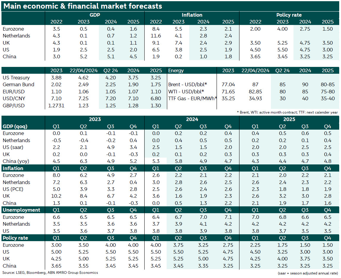 ECB – The ECB kept policy rates unchanged in April. In the Policy Statement the ECB explicitly mentioned rate cuts for the first time. In the press conference the ECB made clear that if the inflation outlook, underlying inflation and the strength of monetary policy transmission were according to expectations, it would be appropriate to cut the policy rate. We believe these three conditions have been largely met already and continue to expect a June start to rate cuts, after which the ECB will cut rates at each meeting from June onwards for a total of 125bp rate cuts.