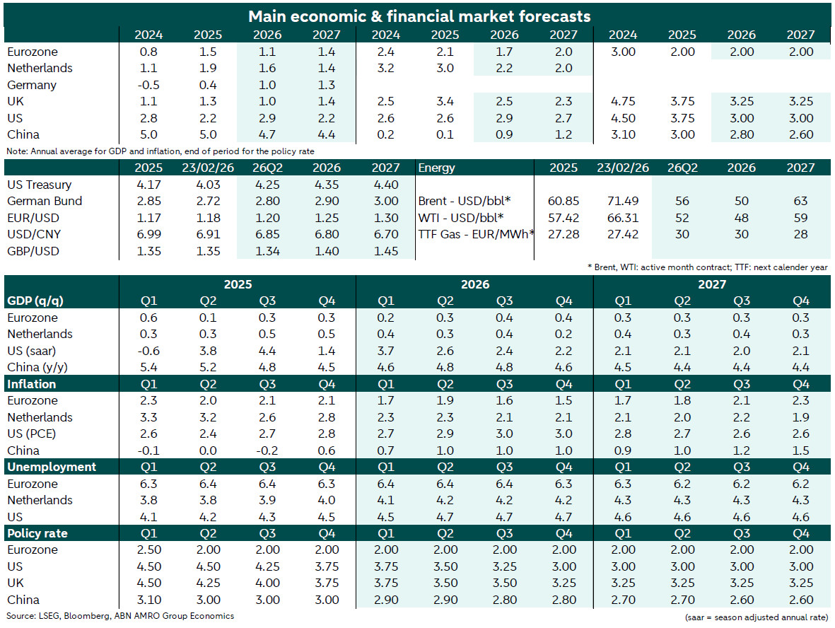 At the end of January the dollar weakened and EUR/USD rallied to a high of 1.2081. The focus was back on the US and the uncertainty in policy. There was also fear that US and Japanese authorities would intervene in FX markets to sell USD/JPY. Since then, the dollar has recovered in a volatile manner. In recent days renewed uncertainty around US tariffs has resulted in modest dollar weakness. For this year we expect a lower dollar and a higher euro. Main reasons are: uncertainty about US policy, lower US real yields, concerns about US structural deficits and more FX hedging. Our forecast for the end of 2026 stands at 1.25.