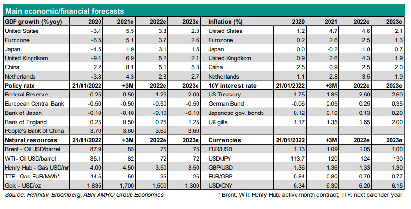 Macro and Central Banks & Markets summarized from our Global Monthly: We expect the post-pandemic recovery to continue in 2022, with above trend growth to resume in the eurozone, the US and China following the current Omicron-induced soft patch. However, uncertainty over the economic outlook is now arguably the highest it has been since the start of the pandemic in early 2020. While economic growth has been strong, as economies have largely opened up, the supply-side has struggled to keep up with resurgent demand, with the consequence being inflation. This has brought forward the likely timing of interest rate rises in the US, with the Fed expected to begin raising rates in March. While we do not expect the ECB to follow, given the very different macroeconomic circumstances in the eurozone, this will have global spill-over effects over the coming year, pushing bond yields higher and ultimately dampening growth.