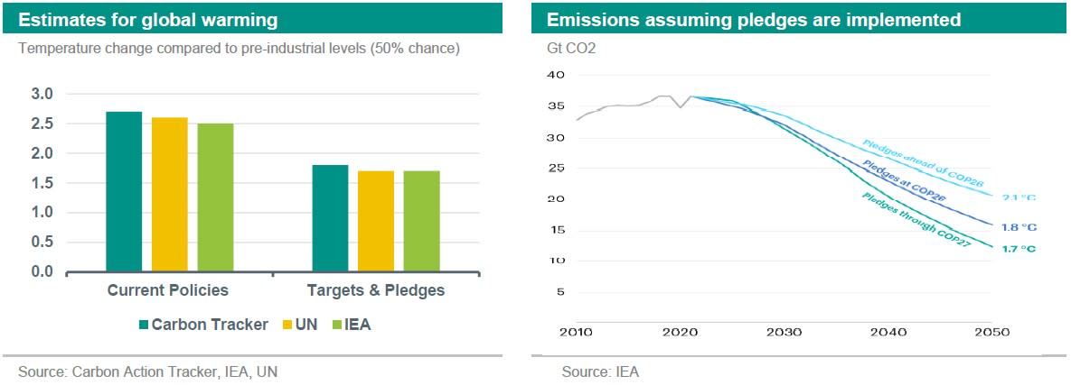 COP27 made limited progress on the key issues on the agenda. The end communique did not include a pledge to shift away from fossil fuels. The agreement to set up a Loss and Damage Fund was an important step, but there were no specific funding commitments, and it is only a part of the external funding needed. Meanwhile, the step up in emission pledges was modest.