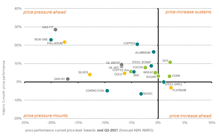 The main downside commodity price risk stems from the strengthening of the dollar and commodity supply recoveries. Next to that, the pull back of monetary easing measures by central banks and when governments wind down their economic stimulus packages pose a downward price risk.