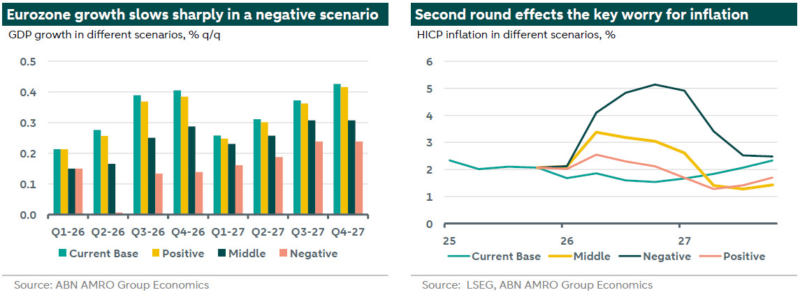 For the Netherlands, the implications broadly mirror those of the eurozone. The impact will depend on how the conflict evolves. Across the central, negative, and positive scenarios, the transmission to the economy is expected to occur more through higher inflation than through a pronounced near‑term growth shock.