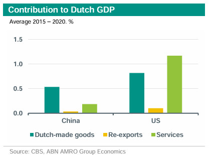 We think the macroeconomic impact of the US-China trade tensions on the Netherlands remains limited, but scarcity of critical raw materials could – for instance – lead to price rises, policy challenges and operational delays (read more here). Moreover, on average in the years 2015-22, about 8% of the total Dutch goods import originated from China and similarly from the US. From China, around 55% is machinery and transport equipment (mostly consisting of computers, phones, solar-panels etc.). Which means that sectors or developments dependent on these imports could be affected, such as the telecom sector or the energy transition which is dependent on solar panels. However, about two-thirds of all imports from China are re-exported. In terms of Dutch goods exports, on average in the years 2015-22, about 4.2% go to the US and 2.1% to China. Most of the value added from trade with China to the Dutch economy comes from exports of Dutch-made goods. Over 2015-20, exports of Dutch-made goods to China contributed on average 0.5% to GDP, while re-exports make a near negligible contribution. Overall, the direct exposure of Dutch exports is relatively small and – even in a continued de-risking scenario – we would expect exports to China to continue.