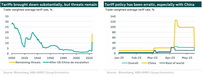 This morning, China and the US announced a significant de-escalation in the trade war, bringing the bilateral tariffs of 145% (on Chinese exports) and 125% (on US exports) down to 30% and 10% respectively. The 30% tariff encompasses the liberation day package universal rate of 10% and the 20% fentanyl-related tariffs but excludes the various section 232 sector-specific tariffs, as well as any tariffs at the start of the year. All combined, this lowers the US average tariffs on China from well over 100% to around 40%, while the total trade weighted average tariff rate on US imports drops to slightly above 10% from over 20% before the weekend. A decoupling is averted for now, limiting downside risks to both economies, and reducing the risk of an extended supply shock in the US. Still, both the China and overall tariff rates are four times higher than they were at the start of the year, which continues to exert negative pressure on especially the US economy, although by less than the policy in place before the weekend.