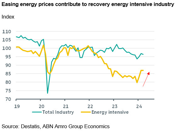 Although the monthly data trends for both series tend to be very volatile, this week’s figures are consistent with earlier PMI releases indicating the sector remains in recessionary territory. However, we remain of the view that the outlook is improving and activity is bottoming out, albeit not set for a strong recovery. Indeed, on balance since the start of the year, industrial production has edged up. A better macro environment, such as solid construction activity and increasing export volumes, as well as easing energy prices have helped industrial activity in the first quarter. Lower energy prices have also meant energy-intensive industrial firms (some 17% of total industry) have regained some of their competitiveness losses in the past months. This has contributed to an improvement in total industrial production. While not out of the woods yet, headwinds for the German industrial sector are slowly easing.