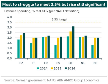 The target is set to be reached over a 10 year time horizon, with countries to submit “annual plans showing a credible, incremental path to reach this goal,” and “spending under this plan will be reviewed in 2029, in light of the strategic environment and updated Capability Targets.” The long time horizon and use of the term ‘incremental’ – combined with the interim 2029 review – clearly gives maximum leeway for the target to be met, and this leeway was likely instrumental in getting all countries on board. All of this adds to our conviction that really big rises in defence spending will be confined chiefly to Germany.