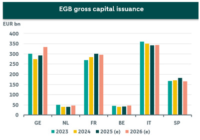 For the other big-6 countries, our supply outlook is relatively modest compared to Germany. As discussed above, not all countries have set targets as ambitious as Germany and lack the fiscal capacity to do so. Consequently, with ongoing fiscal consolidation in most European countries, a slight increase in defence spending is unlikely to significantly impact the budget balance. Therefore, the financing need will be lower for most countries in 2026, except for Belgium and the Netherlands as we forecast higher deficits (and higher redemption for Netherlands in 2026).