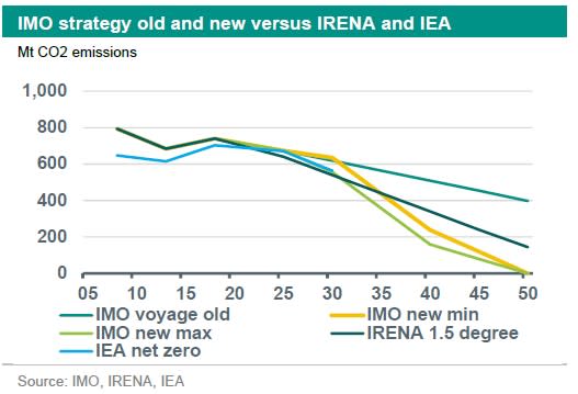 International shipping is responsible for 2% of the global greenhouse gas emissions. The IMO has revised its strategy to bring down greenhouse gas emissions faster. It aims to be net zero by or close to 2050 in a hard to abate sector. It has also set some indicative targets for 2030 and 2040. In addition the IMO has as target that the uptake of zero or near-zero GHG emission technologies, fuels and/or energy sources to represent at least 5% and striving for 10% of the energy used by international shipping by 2030. This comes at a time that the marginal abatement costs of these technologies/fuels are still very high and the fuels are not produced in large quantities. The new IMO pathway is roughly in line with IEA net-zero (up to 2030) but more ambitious than the IRENA 1.5-degree pathway. Overall we think the new IMO pathway is very ambitious and may not take into account the challenges. Changing the energy carrier is crucial and with that comes other challenges such as safety using a new energy carrier, adjusting design of the ship, and the engine readiness of using a new fuel. So the path to decarbonize shipping is likely to be a long one.