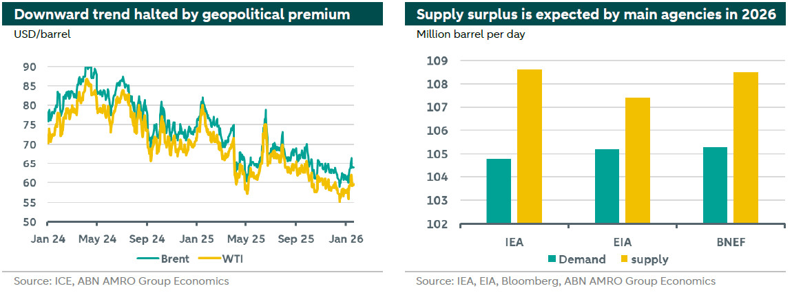 The downward trend in oil prices was reversed in 2026 as markets responded to rapid geopolitical developments. The overthrow of Venezuela's leadership, new U.S. sanctions on Iran, ongoing threats against the Iranian regime, and the slow progress in peace negotiations to end the war in Ukraine have all contributed to an increase in the geopolitical risk premium for Brent crude prices. Despite these pressures, the surplus in oil supply has helped to cap further price increases. Meanwhile, OPEC+ has maintained its decision to pause production increases for the first quarter of the year. Global demand has proven more resilient than anticipated, though the outlook remains clouded by growing tensions between the U.S. and the EU over Greenland, including the potential for new U.S. tariffs and possible EU retaliation. Given the rising geopolitical uncertainties and the dynamic nature of recent events, we choose to leave our outlook unchanged for now. At the time of writing, Brent crude is trading at $64.1 per barrel.