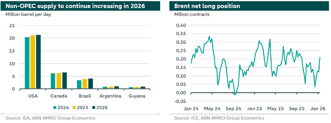 Fourth, the growing tension between the U.S. and the EU over Greenland has further contributed to market uncertainty. The U.S. President has threatened to impose a 10% tariff on several countries starting in February, with plans to raise it to 25% by July if no agreement is reached. In response, the EU is exploring various retaliation strategies (refer to our Top of Mind analysis for details; see here and here). These additional tariffs across the Atlantic could negatively impact economic growth, alter trade flows, and ultimately lead to lower oil demand, exacerbating the existing supply surplus.