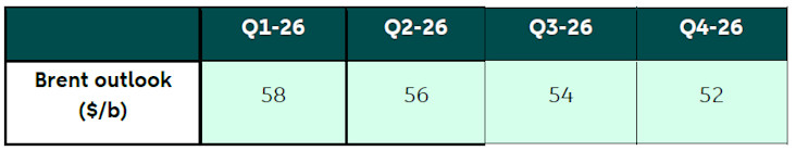 For now, we are keeping our outlook unchanged, while recognizing that the market remains highly sensitive to geopolitical developments, which are difficult to predict at this stage and could potentially shift the forecast. The primary supply-side risk stems from escalating tensions in the Middle East, which could amplify the current geopolitical premium. In a scenario involving the closure of the Strait of Hormuz, oil prices could surge by as much as 50%. On the demand side, the outlook may shift significantly if tensions between the U.S. and the EU deteriorate further and reach a stalemate. We summarize below our outlook for Brent in the coming quarters.