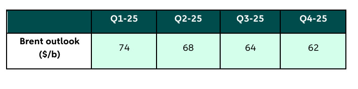We retain our view of a market surplus in 2025. This is given the lackluster global demand and the strong supply form non-OPEC+ countries, which is expected to increase even further under the new US administration’s policies. We think that the new sanctions on Iran and the uncertainty of the extent and the level of American tariffs, along with the potential positive frontloading impact of expected tariffs would put an upward pressure on prices, while the idle OPEC+ capacity would mitigate volatility and put a lid on price increases. As things clear out along 2025, we expect prices to see a decrease driven mainly by the slowdown in demand growth. Accordingly, we revise our outlook for Brent upward to average 74 $/b in Q1 of 2025 (was 70 $/b). We hold our outlook for the rest of 2025 where Brent is expected to end the year with 60$/b. Below is a summary of our Brent outlook for 2025.