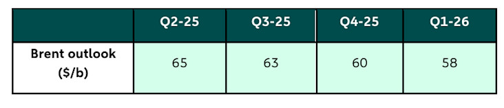 We think that the prospects of a market surplus in 2025 are strengthened further especially if OPEC+ continues with its supply increases combined with the lackluster global demand, while low price levels and higher costs limit the supply growth form non-OPEC+ countries. However, the outlook remains clouded by deep uncertainty concerning the final scope and timing and levels of any additional US tariffs, especially those related to geopolitical outcomes, such as those associated to an Iranian nuclear deal or Russia agreeing to a ceasefire. In the short term, we think the front-loading impact following the 90 days pause on the tariffs will help to put a bottom under prices. However, this will likely prove a temporary reprieve, and we expect prices to see a decrease in the second half of 2025 driven mainly by the slowdown in demand growth. Accordingly, we revise our outlook for Brent slightly downward, where we expect Brent to average 65 $/b (was 68 $/b) in Q2 and end the year around 58$/b (was 60 $/b). Below is a summary of our Brent outlook for coming quarters.