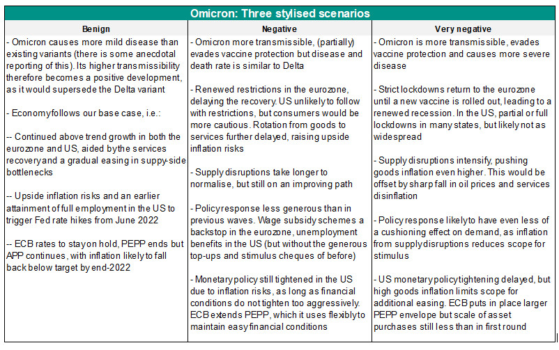 Omicron appears to be more transmissible, and could partially evade vaccine immunity. However, disease severity remains unclear – a crucial factor in determining its impact on the outlook. In a negative scenario, Omicron could trigger renewed lockdowns and contractions in GDP, while exacerbating supply bottlenecks and posing further upside risks to inflation. Given supply-side constraints, support from policymakers is likely to be much more modest.