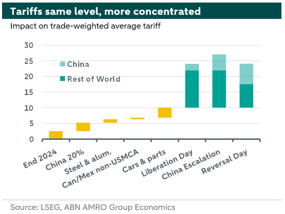 The tariff’s impact on the US is two-fold. There are near-mechanical effects on inflation and growth, directly stemming from price increases due to the added tax. A (partial) reversal of the tariffs immediately lessens this direct blow. Even if the total trade-weighted tariff is back at the level implied by the original Liberation Day plan, the more concentrated nature of high tariffs on China and lower on everyone else, limits the impact as there’s more scope for rerouting and substitution. This will also endogenously lower the trade-weighted average tariff quite quickly as demand for Chinese goods declines. Still, the confidence and sentiment effects in the US, both domestic and external, from the administration's economic attacks and policy uncertainty remain. Even if tariffs are fully reversed, it seems unlikely that business will continue as it did in 2024, with the world likely moving away from their dependence on the US and the dollar. The near-term also remains murky, due to large policy uncertainty and volatility. The extent to which companies believe that higher tariffs will indeed start in July, will determine whether companies will continue to build inventories, and whether net imports will remain a drag on growth throughout Q2, or whether we will see the previously anticipated reversal. Overall, yesterday’s developments only strengthened our view on the Fed keeping rates at their current level until well into 2026. There will still be a substantial inflationary impact, and recession risks have abated somewhat. (Rogier Quaedvlieg)