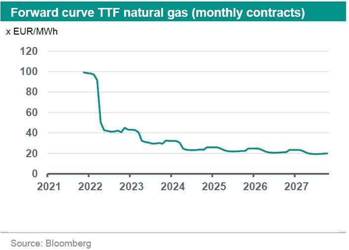 Despite the great uncertainty about the level of gas prices in the coming months, we have already adjusted our gas price estimates upwards. Crucially, our new forecasts assume an average winter and therefore an average demand for gas. We also expect gas stocks to start to fill up again in spring following a normal pattern. A third assumption is that the European Commission will not take any measures to buy extra gas or build up strategic stocks in the short term. Nevertheless, we are also assuming higher gas prices for all of 2022 compared to recent years. This is due to the continuing high global demand for natural gas in order to reduce the use of other energy sources (such as coal and nuclear power). Also, the supply of LNG is no longer increasing, so there are more buyers for an at best unchanged amount of natural gas. The persistently high price of CO2 also contributes to the higher price of natural gas. In our estimates, we look at the contract with delivery for the coming delivery year. For the end of this year, we have increased our estimate from EUR 30/MWh to EUR 50/MWh. For the end of 2022, we still expect a price of EUR 30/MWh, which is 50% higher than in our previous estimate. Only in 2023 do we see a normalization of gas prices. For more details, see the table at the end of this note.