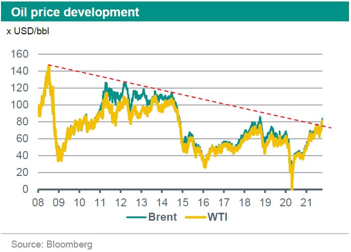 Oil demand has picked up faster than expected. Partly due to economic growth, but also partly due to additional demand as a result of high prices in other energy markets. With the high price of coal and natural gas, more oil is being used worldwide for electricity production and in the form of fuel oil for industrial processes and for heating. The market had hoped that OPEC+ would be willing to increase production more quickly. As a result, the oil price found even more support.