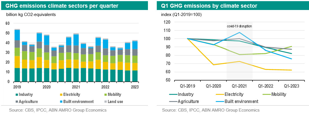 Reduced natural gas consumption due to high gas prices have notably contributed to the decrease in GHG emissions. This is especially the case in agriculture (greenhouse horticulture), industry (in making food, paper, metal, building materials, chemical and also petroleum products) and in the case of households (heating in built environment) there has been a rationalisation in gas consumption. Most climate sectors showed annualised reductions in the first quarter of 2023. The sharpest reduction took place in the built environment (-12%) and industry (-8%), followed by agriculture (-3%) and electricity (-1%). The mobility sector is the only sector to record an increase in GHG emissions in the first quarter of 2023, of as much as 10% year-on-year. This puts the sector's emissions back at a similar level to pre-corona pandemic emissions. Compared to the other climate sectors, the emissions reduction trend in the mobility sector most disappointing. In this sector, the downward trend is considerably weaker. Road transport is the biggest polluter in the mobility sector. It is responsible for about 95% of the mobility sector's total emissions. Accelerating electrification in the mobility sector still faces obstacles, not only in passenger transport, but also for commercial vehicles. Affordability, range (especially for freight transport), refuelling infrastructure and charging infrastructure are the biggest challenges. See also our analysis here.