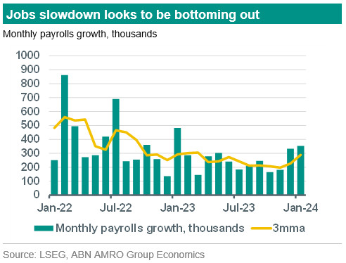 While January activity data came in on the weak side, we are raising our 2024 growth forecast by 0.3pp to 2.1%, which is now well above the consensus forecast of 1.6%. The change is driven by the more resilient labour market, which is likely to mean a shallower slowdown in consumption than we previously expected. With labour market tightness continuing to ease, however, we still expect the Fed to hit its 2% inflation target before the middle of the year, paving the way for rate cuts in June.