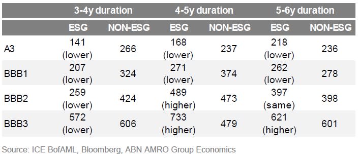Based on the refinancing of the issuers’ 2023 and 2024 maturities at today’s yield on a 4 year maturity bond of that same issuer, the effects on coverage indeed seem to be more severe for the ESG issuers