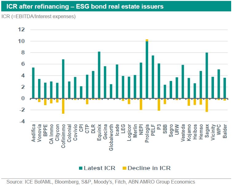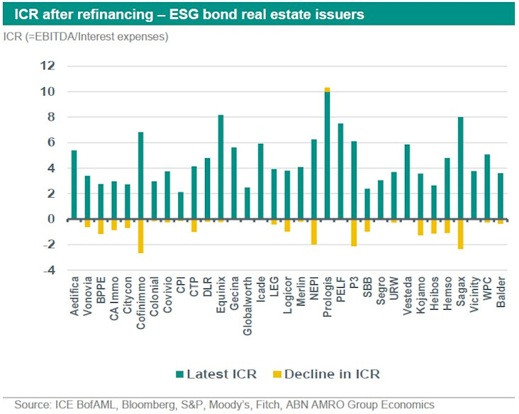 However, these ESG issuers have a slightly better coverage to begin with and therefore the higher interest rates are only equalizing the aggregate ICR between ESG and non-ESG real estate issuers