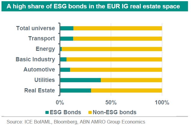 The real estate sector has been a large issuer in the ESG bond space, largely through use of proceeds green bonds. Indeed, many issuers already have or are willing to invest in properties which meet the required demands in terms of energy label for example. The chart below shows that out of all the energy intensive sectors, real estate ranks second (after utilities) in terms of share of ESG bonds in the total EUR IG bond mix.