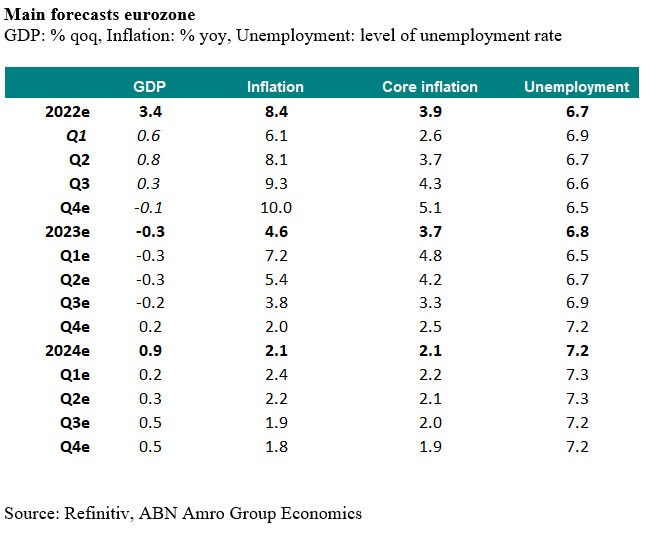 We have changed our base scenario for the eurozone economy. We have revised upward our forecasts for GDP growth in 2022Q4-2023Q1 and have lowered our forecasts for growth during the second half of 2023. There is a number of reasons for these adjustments. To begin with, the economic impact of the energy crisis has been more benign than we thought at the end of summer, when almost all gas flows from Russia to Europe came to a halt. Indeed, there has been no rationing of gas supply to industry and global energy prices have dropped sharply in the past few months, which has also resulted in a drop in energy price inflation. Next, we had expected a rebound industrial production in the second half of 2022 on the back of the clearing of backlogs after the easing of supply bottlenecks, but this rebound has been stronger than expected, particularly in motor vehicle production in 2022Q4. This has also translated in sharp jumps in new car registrations, which will (temporarily) lift private consumption growth in 2022Q4 and probably also moving into 2023Q1. Finally, the impact of monetary policy tightening famously works with long and variable lags and we judge that most of the cumulative impact of past and upcoming rate hikes and tightening financial and bank lending conditions is still very much to be felt on the economy. As a result, we now forecast a more shallow, but more prolonged recession, with GDP contracting modestly during four consecutive quarters, starting in 2022Q4. Average growth in 2023 is expected to be -0.3%, versus our earlier forecast of -0.9%. Our growth forecast for 2024 has been lowered to 0.9%, down from 1.2%. Although the tightness of the labour market could result in some labour hoarding and loss of productivity during the first two quarters of the recession, we expect the unemployment rate to start rising gradually as from around the second quarter of 2023 onwards. This rise in unemployment (and lower inflation) should weigh on wage growth during the second half of this year and in 2024. Though wage growth will probably accelerate noticeably in the coming months.