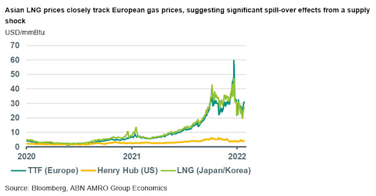 The US is a net exporter of both oil and gas, and is therefore largely insulated from external supply disruptions, though it can still be affected by price spill-overs. China is a net importer of gas, but it currently enjoys a surplus in LNG stocks and has even been selling some of this surplus recently. Japan and Korea do import some oil and gas from Russia, but the share in total energy imports is limited. Nevertheless, the LNG prices paid by Japan and Korea – specifically that which is not subject to long-term contracts – is tightly linked to those of gas prices in Europe. This is because, when supply is tight in Europe, it competes with Asia for LNG on the global market. As such, Japan and Korea might also be significantly impacted by a surge in European prices, though the degree to which it is affected will depend on just how much non-contracted gas it needs, which as in Europe depends on the severity of the winter.