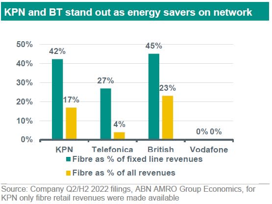 The use of proceeds on the new KPN hybrid will largely go into expanding the fibre optics (a.k.a. fibre) fixed line connections. Fibre optic produces nearly 37% less carbon emissions than for example traditional coax cable internet connections, according to a study on a sample of German homes. Closest peer Vodafone has no pure fibre internet offering, it still uses coax cable with bits of fibre. But also lower rated Telefonica is less advanced than KPN in the monetization (hence use) of fibre optics. This can be seen in the chart below, which shows the percentage of fibre internet revenues against fixed line revenue and total revenues of the issuers as per latest financial filings. Only BT has a (slightly) higher penetration of fibre internet than KPN. Still, against Vodafone, the KPN bond stands out in terms of green benefits.