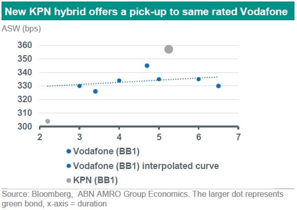 Dutch telecommunications company KPN came to the market last week with a debut green hybrid bond. While KPN’s senior bond in SLB format trades at a small greenium to its closest peer bonds (issued by Vodafone), we note that the new hybrid landed at 22bp of pick-up to the interpolated Vodafone hybrid curve.